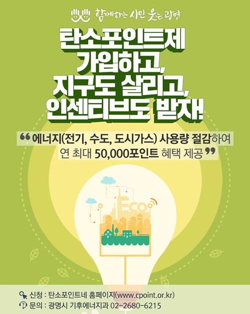 [한국연예축제일보, 김재만기자] 광명시는 저탄소생활 실천으로 온실가스를 줄이고 생활비 절약과 인센티브까지 받을 수 있는 1석 3조의 ‘탄소포인트제’를 실시한다.