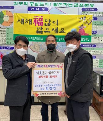 [한국연예축제일보, 유혜경기자] 김포본동행정복지센터에 1월29일, 김포본동 새마을 지도자 협의회, 김포한강라이온스클럽, 김포본동 자율방재단 회원들이 찾아와 설날을 맞이하여 취약계층 독거노인에게 전하고 싶다며 식품세트 30개를 기탁했다.