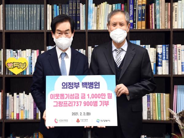 [한국연예축제일보, 유혜경기자] 의정부시는 2월 2일 의정부백병원의 우영섭 이사장, 표재훈 행정부원장, 유경희 간호부장이 의정부시 이웃돕기 창구에 성금 1천만 원과 건강음료 900병을 기탁했다고 밝혔다.