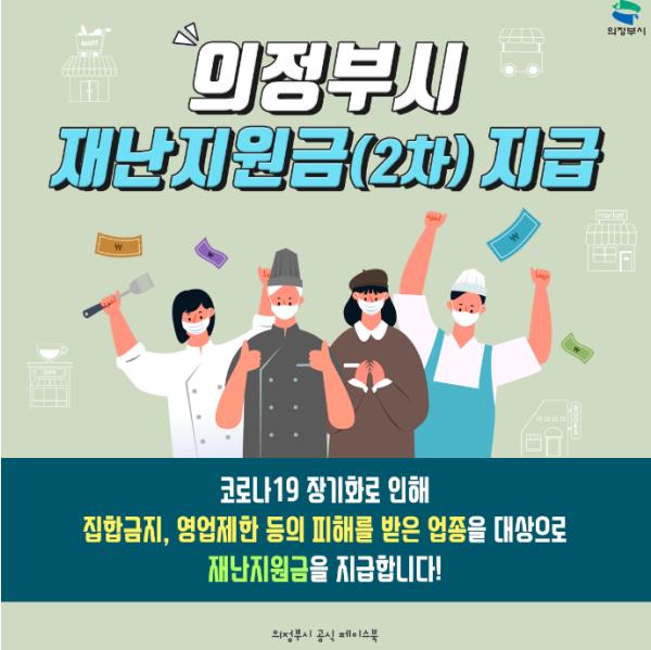 2월 1일 의정부시 재난지원금(2차) 긴급 지원 기자회견을 통해 집합금지와 영업제한 등으로 피해를 입은 24개 업종 1만2천674개소의 소상공인을 대상으로 2차 재난지원금을 43억을 지급함에 따라 어린이집도 기타 피해업종으로 분류되어 어린이집 402개소가 각각 30만 원의 재난지원금을 지원받을 수 있게 된다.