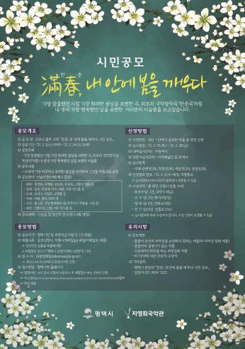 평택시 관계자는 “본 공모를 통해 시민들이 코로나19 시대 우울함을 이겨내고 우리 안에 꿈틀대는 희망의 봄을 꽃피웠으면 좋겠다”고 밝혔다.