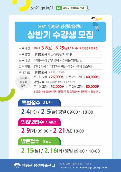 [한국연예축제일보, 유혜경기자] 양평군에서는 2월 4일부터 21일까지 13일간 21년 상반기 평생학습센터 프로그램 수강생을 모집한다.
