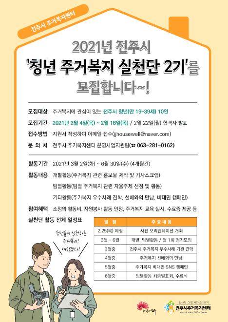 전주시 주거복지센터는 오는 18일까지 지역 내 주거복지에 관심이 있는 만 19~39세 청년을 대상으로 ‘전주시 청년 주거복지 실천단 2기’ 10명을 모집한다.