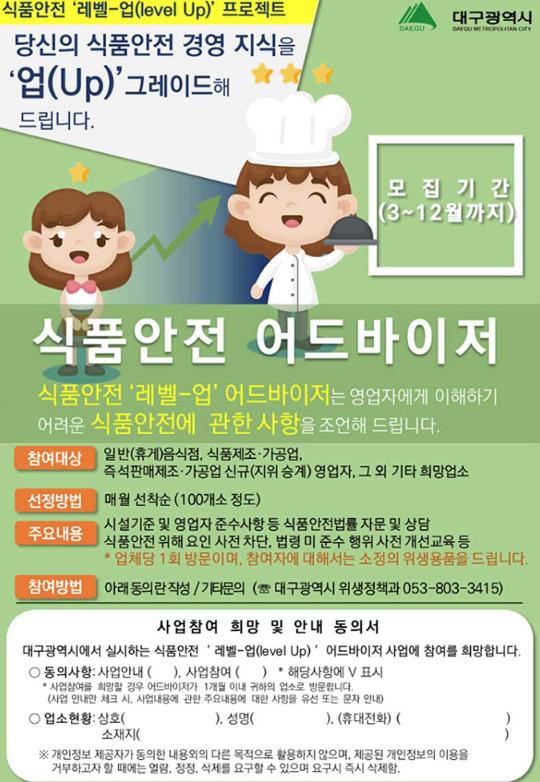 [한국연예축제일보, 유혜경기자] 대구시는 식품 관련 사고를 예방하고 영업 초기 안정적인 영업기반 확보를 지원하기 위해 올해도 지역의 식품 및 외식업소를 대상으로 ‘식품 안전 레벨-업 어드바이저’ 사업을 실시한다.