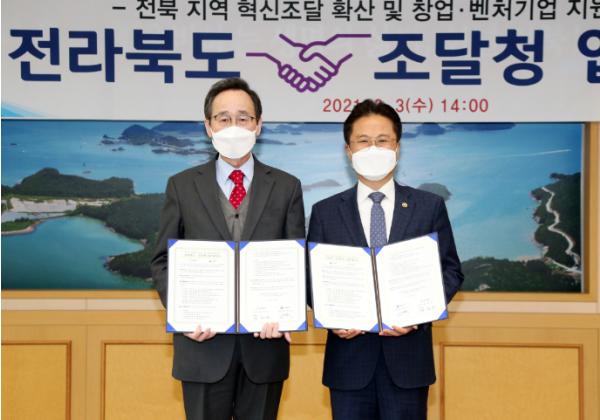 [한국연예축제일보, 유혜경기자] 전라북도는 3일 도청 회의실에서 조달청과 함께 혁신조달 성과 확산 및 창업·벤처기업 육성을 위한 업무협약을 체결했다고 밝혔다.