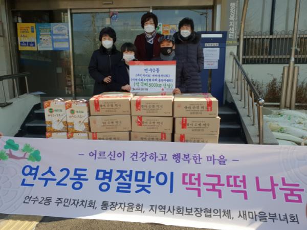 [한국연예축제일보, 유혜경기자] 인천광역시 연수구 연수2동 자생단체들은 민족의 최대명절인 설을 맞아 이웃들이 설을 행복하게 보내고 건강하길 기원하는 마음을 모아 지난 2일 저소득 주민 500명을 대상으로 떡국떡과 음료수 나눔행사를 가졌다.