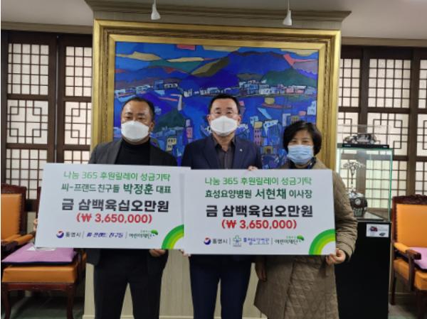 이날 후원 릴레이를 이어가는 기탁자는 용남면에 위치한 효성요양원 대표서현채 이사장과 산양읍 소재 낚시 전용선 운행업체를 운영하는 씨프랜드 박정훈 대표로, 평소 어려운 이웃을 위한 선행에 앞장서고 있으며 특히 어린이를 위한 정기적인 기부를 하고 있던 중 나눔 365 후원릴레이에도 동참하여 1년간 모은 기부금 365만원의 성금을 각각 전달하였다.