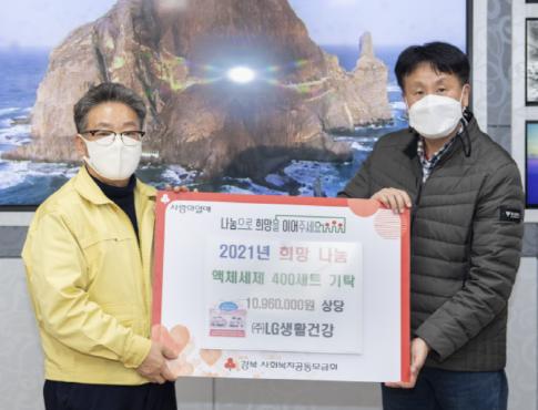기탁식은 기상악화로 인해 LG생활건강 김영진 부장이 대표로 참석하였으며, “코로나19 장기화로 관광산업이 많은 비중을 차지하는 울릉도에 적잖은 피해를 입었을 것으로 판단되는데 실생활에 큰 도움이 되길 바라는 마음에 기탁하게 됐다.”며 마음을 전했다.