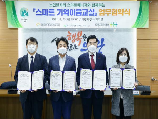 [한국연예축제일보, 황해식기자] 의왕시는 2일 시청 소회의실에서 의왕시니어클럽(관장 신승희), 아름채노인복지관(관장 박승우), 사랑채노인복지관(관장 금유현)과 함께‘스마트 기억이음교실’업무협약을 체결했다.