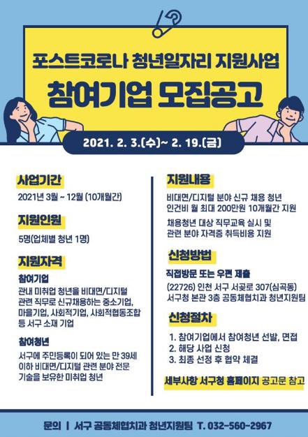 [한국연예축제일보, 안성경기자] 인천 서구는 지역주도형 청년일자리사업의 올해 신규 사업인 ‘포스트코로나 청년 일자리 지원사업’에 참여할 서구 소재 기업을 이달 3일부터 19일까지 모집한다고 3일 밝혔다.