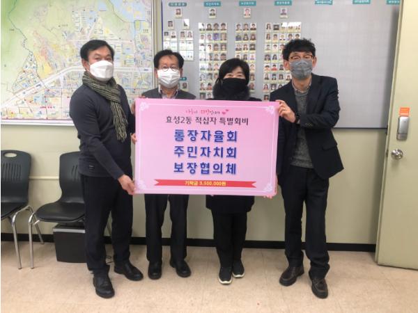 지난 29일 효성2동 통장자율회(회장 강경덕), 주민자치회(회장 박만옥), 보장협의체(위원장 정민기)는 구성원 모두 코로나19 등으로 사회적, 경제적 어려움을 겪고 있지만 좀 더 어려운 이웃들과 재난을 당하는 국민들을 지원할 수 있도록 적십자특별회비 350만 원을 기탁했다.