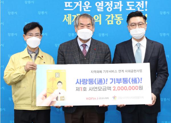이날 전달식에는 변동훈 코나아이 부사장, 왕종배 지역사회보장협의체 위원장 등 관계자가 참석하여 기부액 2,000,000원을 강릉시에 전달했다.