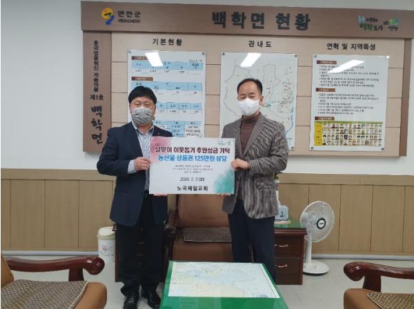 [한국연예축제일보, 유혜경기자] 지난 2일 연천군 백학면에 위치한 노곡제일교회(목사 김종환)에서 지역 내 따뜻한 도움이 필요한 이웃을 위해 125만원 상당의 농협상품권을 백학면에 기탁했다. 코로나로 인해 모두가 힘든 시기임에도 지난해에 이어 올해도 지역 내 어려운 이웃을 잊지 않고 돌봄의 손길을 전해 지역 내 훈훈한 미담이 되고 있다.