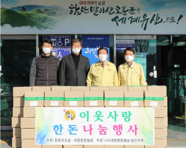 한편, 대한한돈협회 함안군지부는 2011년부터 관내 시설 등에 돼지고기를 전달하는 ‘한돈나눔행사’를 가져왔으며, 소외계층, 저소득층 세대 등에 대한 지원을 통해 따뜻한 나눔을 실천하고 있다.
