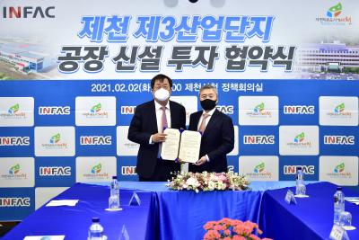[한국연예축제일보, 안성경기자] 제천시는 2일 자동차 부품 생산 전문기업인 ㈜인팩(대표이사 최오길, 최웅선)과 제3산업단지 공장 신설을 위한 2021년 첫 투자협약을 체결하며, 연내 민선 7기 투자유치 1조원 달성에 청신호가 켜졌다.