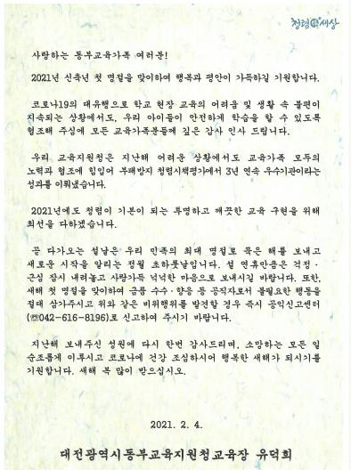 [한국연예축제일보, 서병진기자] 대전동·서부교육지원청은 설 명절을 맞이하여 청렴실천의지를 담은 교육장 서한문을 관내 유·초·중학교 및 교육지원청 교직원들에게 발송하였다.