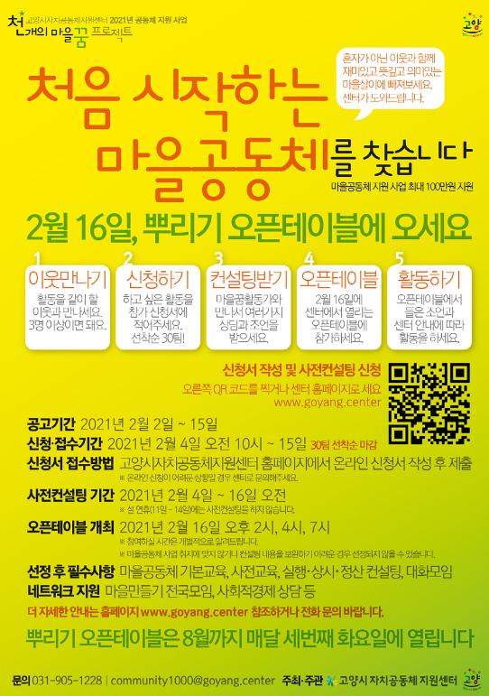 ‘뿌리기’ 지원을 희망하는 공동체는? 고양시자치공동체지원센터?홈페이지에서 내용을 확인할 수 있다. 자세한 문의는 고양시 자치공동체지원센터로 하면 된다.
