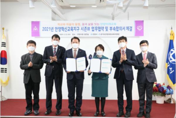 최대호 안양시장과 전성화 안양과천교육지원청 교육장이 3일 안양교육혁신지구 시즌Ⅲ 추진에 상호협력할 것을 다짐하는 mou를 체결했다. 이와 아울러 이재정 경기도교육감과는 서면으로 협약서를 교환했다.
