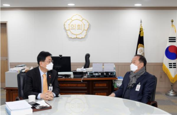 [한국연예축제일보, 변현식기자] 양평군의회 전진선 의장과 정동균 양평군수는 2월 3일 의장실에서 관내 주요 현안 사항에 대해 공유하고 함께 논의하는 간담회를 가졌다.