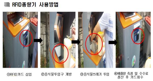 RFID종량기 방식은 가정에서 음식물류폐기물을 배출할 때 먼저 카드를 인식 후 버린 무게만큼 수수료를 부담하는 방식이다. 배출자 부담원칙에 적합해 감량효과가 탁월하고 종량제 봉투 용량에 배출 주기를 맞출 필요 없이 수시로 편리하게 배출할 수 있다. 배출용기가 장비 안에 있어 미관상 깨끗하다는 장점도 있다.