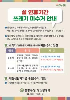 [한국연예축제일보, 유혜경기자] 중랑구는 오는 11일부터 시작되는 4일간의 설 연휴 기간 동안 주민 불편을 최소화하기 위해 쓰레기 처리 종합대책을 추진한다고 밝혔다.