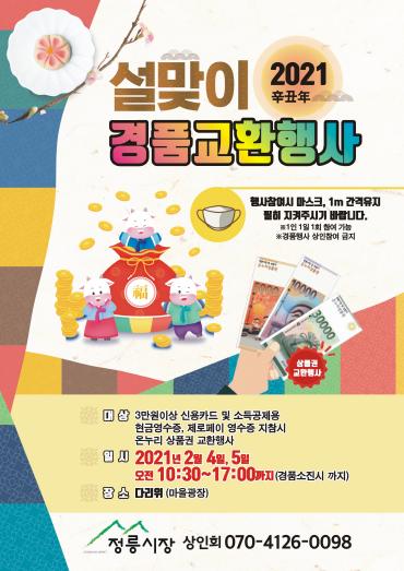 [한국연예축제일보, 유혜경기자] 성북구가 민족 최대 명절인 설을 앞두고 관내 6개 전통시장이 참여하는 ‘2021 설 명절 전통시장 이벤트’를 개최한다. 이번 행사는 코로나19로 인한 지역경제 침체 등으로 어려움을 겪고 있는 전통시장에 활력을 불어넣고, 소비자가 저렴하고 품질 좋은 물건 구매할 수 있도록 지원하고자 마련됐다.