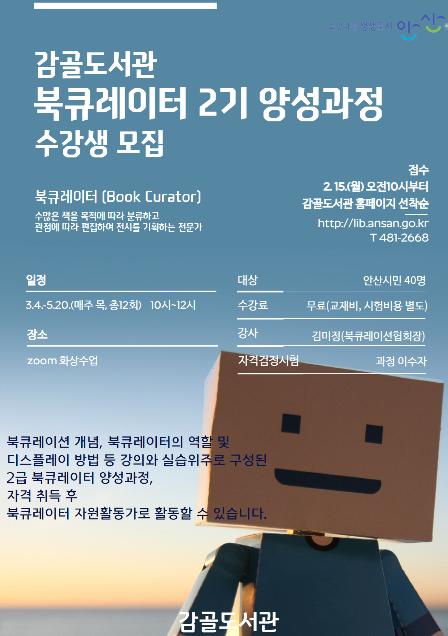 [한국연예축제일보, 유혜경기자] 안산시 감골도서관은 지역주민이 북큐레이터가 되어 직접 도서 선정 및 기획 전시를 할 수 있는 ‘북큐레이터 2급 전문가 양성과정’을 운영한다고 4일 밝혔다.