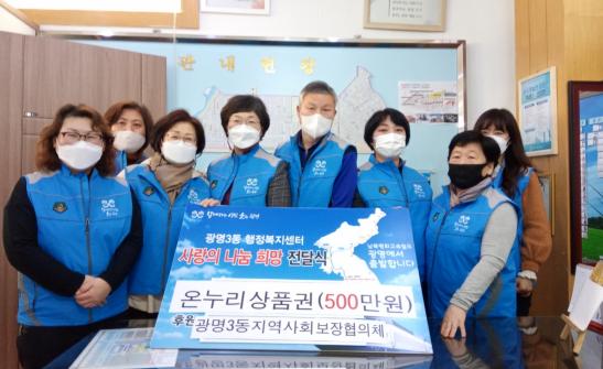 [한국연예축제일보, 유혜경기자] 광명시 광명3동 지역사회보장협의체는 3일 설 명절을 맞이하여 관내 저소득 100가구에 500만원 상당(각 5만원)의 온누리상품권을 전달했다.