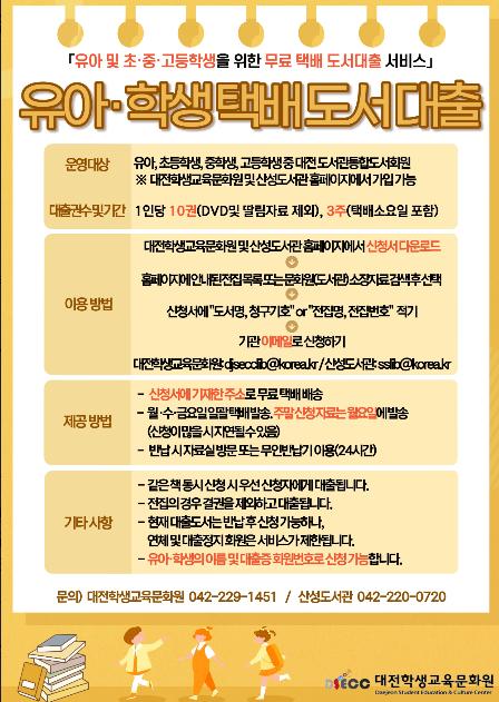대전학생교육문화원(원장 정회근)에서는 코로나19 상황으로 도서 이용이 어려운 유아, 어린이 대상으로 운영했던‘무료 택배 도서대출 서비스’를 초·중·고등학생까지 확대한다고 밝혔다.