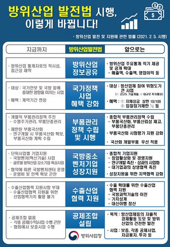 2월 5일부터 시행되는 「방위산업발전법」 및 관련 하위법령의 주요 내용은 방위산업 국가정책사업 지정, 수출촉진, 선제적 부품개발 확대, 공제조합 신설, 방산기업 지원 확대 등이다.