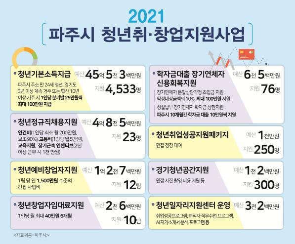 그밖에 올해도 청년기본소득지급에 45억5,300만원이 투입되는 등 청년들을 위한 정책을 마련하고 수행한다. 청년정책은 다름 아닌 파주시 청년들의 의견이 적극 반영되어야 한다는 파주. 2019년 2월 신설·위촉한 파주시청년위원회, 파주시청년일자리위원회와 함께 올해도 청년들을 위한 다양한 지원정책을 차질없이 수행해 청년들이 행복하게 일할 수 있는 파주를 만들어 갈 것이다.