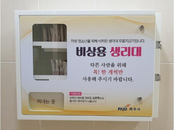 이번 비상용 보건위생물품 무료 자판기는 2020년 9월 25일 「파주시 공공시설의 여성 보건위생물품 비치 및 지원에 관한 조례」 제정으로 지원근거를 마련해 여성이면 누구나 사용이 가능하고 여성이 긴급히 필요로 할 경우 이를 이용할 수 있도록 했다.