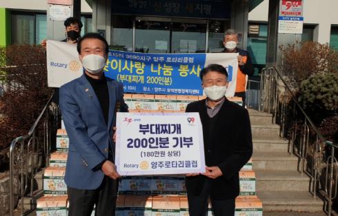 [한국연예축제일보, 유혜경기자] 양주로타리클럽은 지난 3일 광적면 행정복지센터를 방문해 코로나19로 어려움을 겪고 있는 저소득층에 써달라며 부대찌개 200인분을 기부했다.