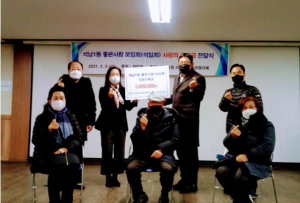 [한국연예축제일보, 유혜경기자] 인천광역시 서구 ‘석남1동 좋은사람 모임회’는 지난 3일 민·관 협력을 바탕으로 하는 석남1동 지역사회보장협의체의 이웃돕기 사업에 500만 원을 기탁했다.