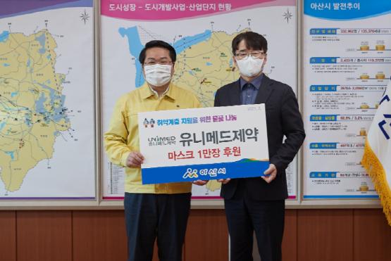 유니메드제약(주)(대표 김건남)이 3일 아산시(시장 오세현)를 방문해 코로나19 극복을 위한 관내 소외계층 지원 마스크 1만장을 기부했다.