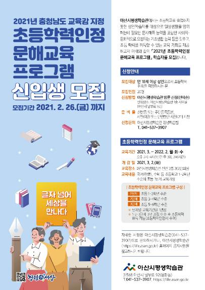 아산시는 초등학교를 졸업하지 못한 성인학습자를 대상으로 일상생활에 필요한 문자해득 능력을 포함한 사회적 문화적 기초생활 능력과 초등학력을 취득할 수 있는 교육 기회를 제공하고자 2021년 초등학력인정 문해교육 프로그램을 추진한다.