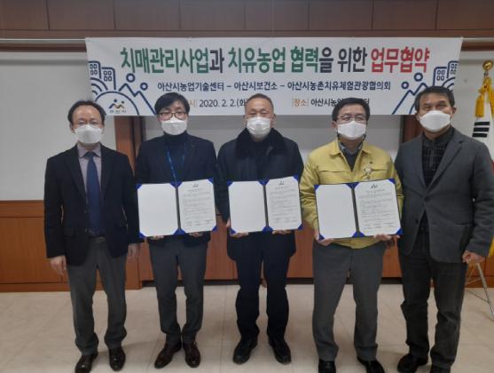 아산시농업기술센터는 충남에서 최초로 ‘아산시 치유농업육성 및 지원에 관한 조례’를 제정했으며 이번 협약을 통해 치유농장과 치매안심센터를 연계한 원예, 동물, 반려곤충 등을 매개로 하는 치유서비스를 제공하기로 했다.
