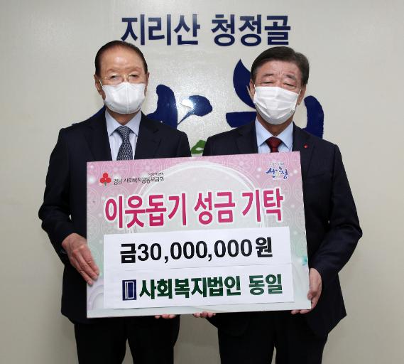 [한국연예축제일보, 유혜경기자] 사회복지법인 동일(대표이사장 김종각)이 지난 3일 오후 산청군을 찾아 이웃돕기성금 3000만원을 전달했다.