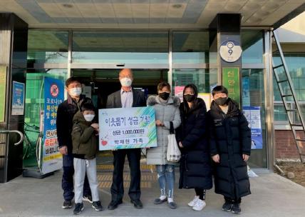 [한국연예축제일보, 유혜경기자] 산청군 신안면에 거주하는 박재현(44)씨 가족(이득윤, 박서희, 박용운, 박용준)이 지난해에 이어 올해에도 이웃돕기 성금 100만원을 기탁했다.