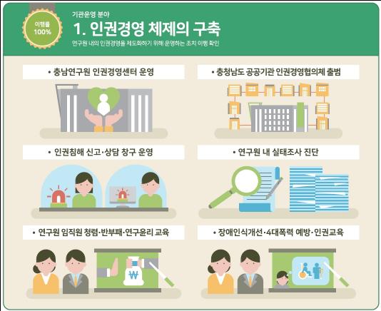 충남연구원(원장 윤황)은 ?년도 자체 인권영향평가’에서 평균 95%의 높은 이행률을 보여 인권친화기관으로 도약하는 초석을 다졌다고 4일 밝혔다.