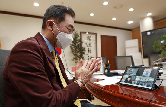 [한국연예축제일보, 유혜경기자] 코로나19 3차 대유행에 따라 5인 이상 모임금지로 이번 설에도 가족 및 친지방문이 어려운 사회복지시설에 작년 추석에 이어 비대면 위문(ZOOM을 이용한 온라인 대면)을 지난 2일 평택시장 집무실에서 진행했다.