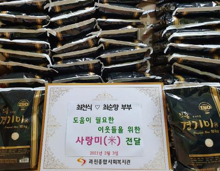 [한국연예축제일보, 유혜경기자] 과천시민 최천식, 최순향 부부가 설 명절을 맞아 쌀 10kg 100포와 마스크 3,500매 등 500만 원 상당의 물품을 과천시종합사회복지관에 기부해 훈훈한 감동을 선사하고 있다.