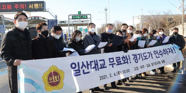 고양?김포?파주 지역 경기도의회 의원 20명은 2월 4일 일산대교에서 경기도 서북부 200만 시민의 교통복지와 차별적인 통행료 부담 해소를 위한 근본적 해결책으로 “경기도의 일산대교 인수를 통한 통행료 무료화 방안”을 제안하고, 이를 위해 관계기관이 전향적으로 협력할 것을 촉구했다.