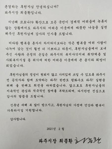 [한국연예축제일보, 유혜경기자] 파주시는 지난 해 어려운 이웃과 소외계층을 위해 나눔을 실천하고 도움을 주신 후원자 800명에게 감사의 마음과 고마움을 전달하고자 서한문을 발송했다.