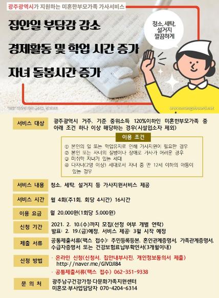 [한국연예축제일보, 유혜경기자] 광주광역시가 홀로 일과 육아, 가사를 책임져야 하는 한부모에게 쉼과 자녀 돌봄 시간을 마련해주기 위해 3월부터 가사지원서비스를 시행한다.