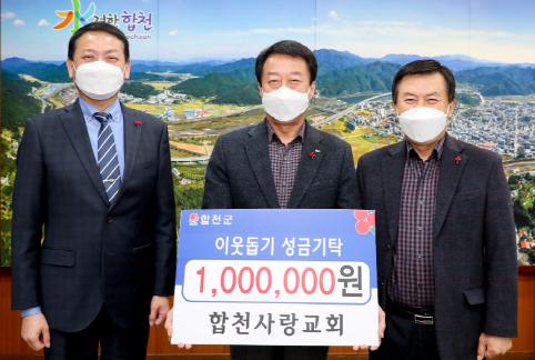 [한국연예축제일보, 유혜경기자] 합천사랑교회는 4일 합천군청을 방문하여 이웃돕기 성금 100만원을 기탁했다.