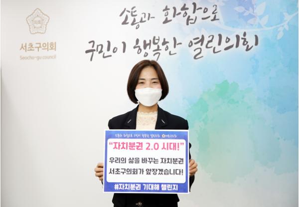 [한국연예축제일보, 변현식기자] 서초구의회 김안숙 의장은 3일 자치분권 2.0시대 개막을 알리고 환영하는 ‘자치분권 기대해 챌린지’에 동참했다.