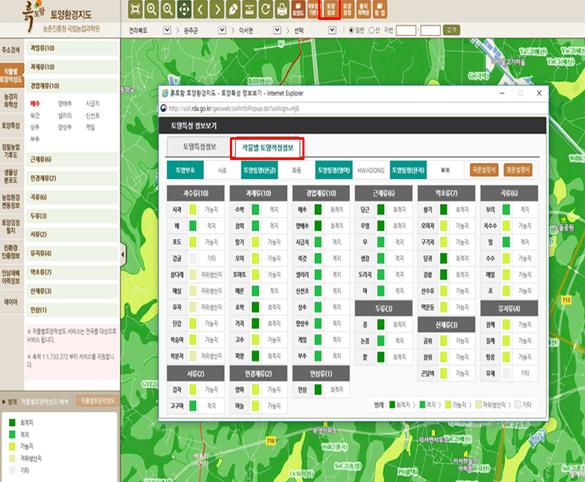이번에 개선된 흙토람에서는 한 번 클릭으로 64작물의 토양적성등급을 한 눈에 확인할 수 있도록 기능이 추가됐으며, 적지 기준을 색으로 표시해 이용자가 쉽게 구분할 수 있도록 했다.