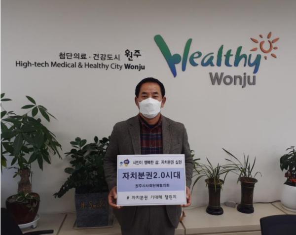 [한국연예축제일보, 유혜경기자] 원주시 사회단체협의회 김정윤 회장은 지난 2일 자치분권 2.0시대를 응원하는 ‘자치분권 기대해’ 챌린지에 동참했다.