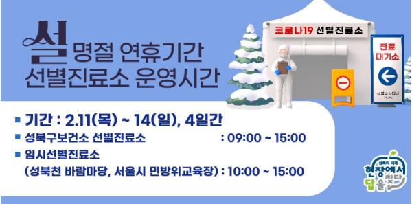 설 연휴에 성북구 보건소 앞에 마련된 선별진료소에서 코로나19 검사를 받고자 하는 구민은 오전 9시부터 오후 3시 사이에 방문해야 한다.